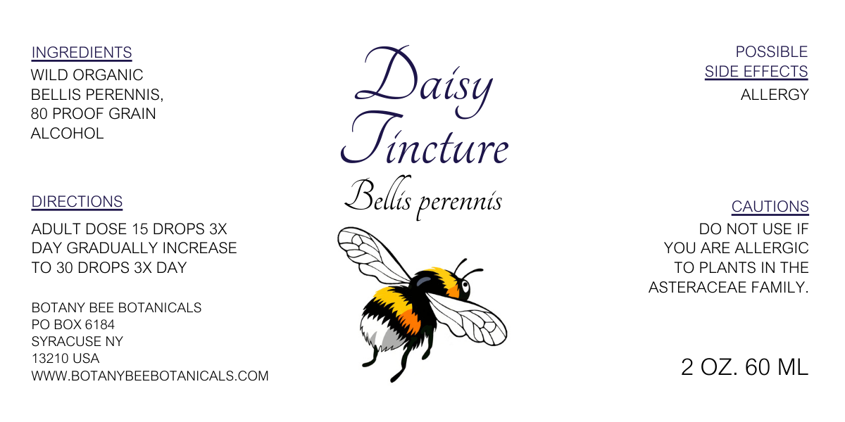 This is a tincture of wild grown common daisies, Bellis perennis, harvested from un-spoiled, private land in the Finger Lakes. Tinctured in 80 proof alcohol for 90 days. Extraction ratio 1:2.