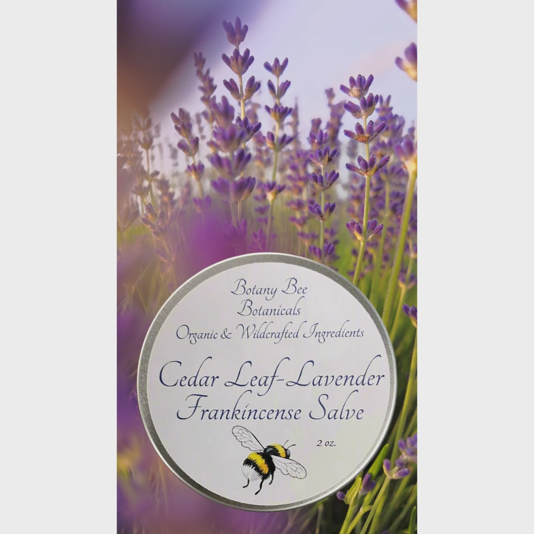 This salve is crafted using wild, organic Eastern white cedar leaf (Thuja occidentalis), home-grown, organic lavender and home-grown organic rosemary. These plants are blended with USDA organic grapeseed oil and pure, locally sourced beeswax, along with a touch of USDA organic vitamin E oil for its antioxidant properties. To enhance its benefits, I have included USDA organic essential oils of frankincense, lavender, rosemary, and peppermint. This combination is both relaxing and energizing while providing nourishing moisture to your skin.